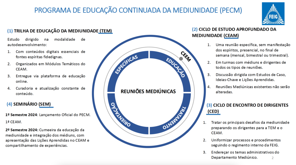 Já os Objetivos Específicos, baseados na premissa da existência das oportunidades de melhoria na educação e prática da mediunidade na FEIG, contemplariam:
